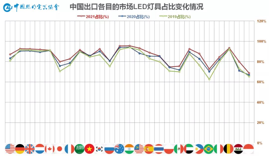 从LED灯具产品出口目的市场情况来看。2021年对前20大市场出口总额为311.9亿美元,比2020年同期的前20增加了28%,占LED照明产品出口总额的比重为75%。随着LED灯具产品一体化、模块化、系统化和智能化程度的提升,在整体出口中所占比重也将逐步增长。
